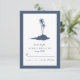 A modern beach wedding rsvp featuring an illustration of an island with two palm trees. Illustration, text, and border are dark blue. Look for matching items such as invitations and save the dates at Jill's Paperie.