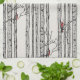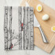 This modern kitchen towel features hand-drawn birch trees with red Cardinal birds perched on branches in black ink, with shading done in cross-hatch style, against an elegant ivory background.