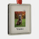 Modern Ivory Custom Name Photo metal ornament with your pet’s name in a gray, bold serif font. Your pet's photo is framed with a thin white line on an elegant ivory background.