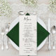 A wedding reception menu featuring a modern motif of a white rose on a ivory-colored background, complete with meal course selections, dessert and detailed descriptions.