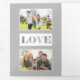 Bold modern "Joy" in silver vertical block letters on template for three photos and text field on silver background. Panels feature additional photo templates and text fields.