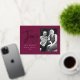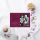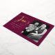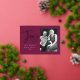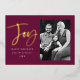 Modern foil holiday card featuring "Joy" in hand-lettered gold foil script with a berry purple background. Personalise the front of the card by adding your favourite vertical photo, custom greeting, name, and the year. The reverse side of the card features a berry and white modern Christmas tree pattern.