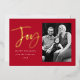Modern foil holiday card featuring "Joy" in hand-lettered gold foil script with a festive red background. Personalise the front of the card by adding your favourite vertical photo, custom greeting, name, and the year. The reverse side of the card features a red and white modern Christmas tree pattern.