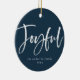 Festive Christmas photo ornament featuring the word "Joyful" in a white, hand-lettered script font against a navy background with your name and the year below. Add your favourite pet or family photo to the back!