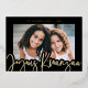 This modern Kwanzaa photo card features a large calligraphy script greeting in raised gold foil over a black background and a single horizontal photo. The greeting on the front says "Joyous Kwanzaa". The backer features a white mudcloth pattern over a black background. The mudcloth pattern and/or the colour backer can be removed if desired. This design is modern yet elegant. Add the "wow" factor with a real pressed foil holiday card this year!