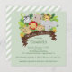 Start your contemporary jungle baby shower, safari baby shower or zoo baby shower off right with our adorable baby jungle animals baby shower invitations. Our modern & stylish safari baby shower invitation for a baby girl or baby boy shower features a cute zebra, giraffe, lion, hippo, monkey, tiger & elephant surrounded by jungle palm tree leaves with a modern brown banner set on a light green background with a pale green & white stripe back. Perfect for a baby girl shower, baby boy shower or a gender neutral baby shower.