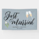 Modern Just Married Wedding Reception Banner is a simple boho blue wedding party banner for your wedding reception party.
