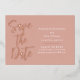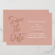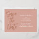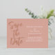 These save the date cards feature a modern, and elegant design on a dusty peach background. "Save the Date" is printed in gold foil, with a large font in a script, handwritten style. The wedding or event information is printed on the right.