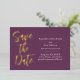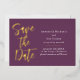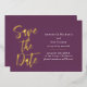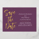 These save the date cards feature a modern, and elegant design on a plum purple background. "Save the Date" is printed in gold foil, with a large font in a script, handwritten style. The wedding or event information is printed on the right.