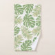 Modern lavender purple and green tropical leaves pattern Bath Towel Set. A beautiful tropical design that includes monstera and palm leaves with gold outline. The bath towel is of purple colour, the hand towel of green and the wash cloth showcases your monogram and a tropical leaf.