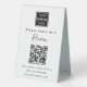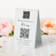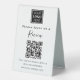 Modern Leave us a review QR code Small Table Tent Sign. Modern, elegant and simple business Small Table Tent Sign to invite customers to leave you a review using a QR code to direct them to your social media, or website this vertical business card features a custom business logo and additional text for tagline or contact information. The perfect strategy to build an audience, increase followers, grow your customer base and create community to generate quality advertisement.