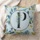 Beautiful design features background of blue and gold leaves on light blue background with monogram/ initial P with leaves embellishment in centre circle