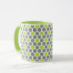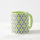 This modern coffee mug features a colourful geometric hexagon pattern in grey and lime green.