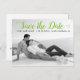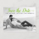 Modern lime green script wedding Save the Date photo postcard. This contemporary typography Save the Date design features a black and white photo of the couple and the text "Save the Date" in a modern script font.