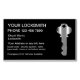 Locksmith business card magnets with image of a cool silver house key symbol and simple layout designed for a locksmith that does lockout service, makes keys, and does mobile emergencies.