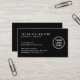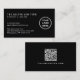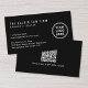 Elegant professional black business card for your employees featuring your logo and your company name, the employee's name and their contact information (e.g., email, telephone numbers, and street address) in clean modern white lettering. On the back, input a URL address to create a scannable QR code linked to your website, or social media profile and add additional text or leave blank.