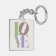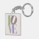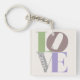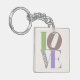 Stylish wedding favour keychain, for the wedding party or each guest, with colourful graphic text reading LOVE. Personalise the text on the keychain, to suit your wedding needs.