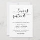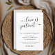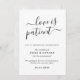 Custom-designed wedding postponement/change the date announcement card featuring "love is patient" modern hand script design.