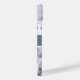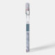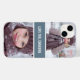 Beautiful modern design iPhone case features 2 of your favourite photos on top and on the bottom with a dark blue grey stripe in the middle with typography.