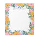 Beautiful floral notepad with a striking floral frame creating a border around the notepad. The flowers and greenery are hand-drawn on a tablet in pink and yellow, and green and blue. The flowers decorate the borders, leaving plenty of room to write down notes, reminders, to do lists and more. Personalize with your name at the top in a very dark blue script.