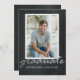 Modern black and white frame Graduation party invitation. Grungy chalkboard background with modern typography. The word graduate in silver script. If you need any help or matching products, please contact us through our store.