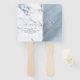 An abstract background reminiscent of glitter-veined marble in shades of dusty blue through steel blue and white is the backdrop for elegant script text and modern design layouts in the pieces of this beautiful wedding suite. The wedding hand fan shown here features your ceremony details on a marble background. Easily add your own names and wedding date on the reverse dusty blue watercolor by using the provided template. Search ID816 to see other pieces and colour choices for this set.