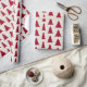 Modern Christmas pattern features maroon geometric trees in varying sizes on a beige background with faux texture. Perfect for elegant holiday wrapping.