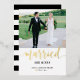 Modern "Married and Merry" holiday photo card for newlyweds features a portrait from the wedding day, gold foil and black custom text that can be personalized with names and wedding date. A small gold foil heart accents the front and a bold black and white pattern of horizontal stripes dresses up the back.