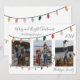Modern, simple and cheerful holiday season card with 3 white framed family photos. Editable Merry and Bright Christmas and a Happy New Year white script typography. Decorated with bright and colourful strings of Christmas lights. Customise and personalise with year and family name to make it unique.