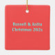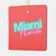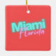 Modern and colourful typographic Christmas ornament features "Miami Florida" in aqua and pink neon text on salmon / coral background. Personalise with names and dates on back.