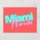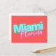 Modern and colourful typographic design features "Miami Florida" in aqua and pink neon text on salmon / coral background
