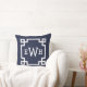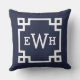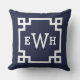 Stylish and modern square accent pillow design features a Greek key geometric border frame design and monogram that can be personalised. Dark midnight blue and white colours. Background colour can be modified.
