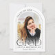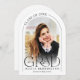 This black and white simple minimalist graduation announcement features a photo, arch frame and elegant modern typography.