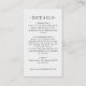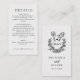 This business card=sized wedding details card offers a refined and elegant way to inform guests while maintaining a cohesive and romantic aesthetic. The front features a timeless black and white design with a delicate dove and floral crest above the couple's names and wedding date in a blend of script and serif fonts. The back presents clearly organised information about the reception, accommodations, RSVP instructions, or any other details using minimalist typography that complements the sophisticated style. Perfect for slipping into your wedding invitation suite, this card is ideal for formal, rustic, or classic weddings seeking stylish simplicity and seamless coordination.