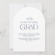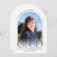This navy blue and white simple minimalist graduation announcement features a photo, arch frame and elegant modern typography.
