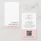 Modern, vertical business cards with your name and title on the front and customisable template fields for your contact information, logo and QR code on the back. White and blush pink or custom colours. You can change fonts and colours, move and resize elements with the design tool.