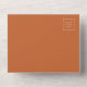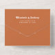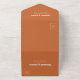 This simple, modern all-in-one wedding invitation features ivory text on a burnt orange background. Add the names of the bride and groom in stylish retro typography and the details in sans serif font. The detachable RSVP features burnt orange text on an ivory background. Add your return address in ivory on the burnt orange exterior flap and on the back of the RSVP.