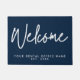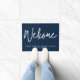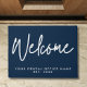 Modern Minimalist Welcome Doormat in dark blue and white with personalised business name.