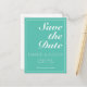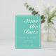 Pretty, modern, minimalist and trendy Save the Date postcard features an aqua blue background (Pantone's 2022 colour pick "Cascade") with white customisable text blocks in modern fonts