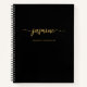 Elegant, Modern, Simple, Black and Gold Monogram Name Feminine Signature Script Spiral Notebook. This minimalist plain colour design featuring your first name in a pretty hand lettered swash tail font typography, with full name template and easy to personalise them. Great custom personalised girly gift for Birthday Party, Bridal shower, Wedding, SWEET 16 Birthday party, BABY shower and for anyone who loves pretty minimalist style.