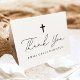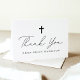 Simple, elegant Baptism thank you card featuring a black cross on the front with "Thank You" displayed in a casual black calligraphy script with a white background. Personalise the front of the black and white Baptism thank you card with your child's name. The inside of the folded thank you card displays a horizontal photo with your message shown below. This design works great for boy or girl Baptisms.