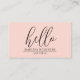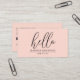 This business card features a simple minimalist script type hello in a grey black typography on a blush pink background. Add your contact information, social media info, and QR code. A simple business card that serves as a friendly introduction.