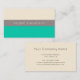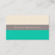 A modern business card design with a clean minimalist design, this card has a seafoam green (aqua), taupe and beige colour block pattern on the front and a simple matching beige background on the back of the card. The type face used is contemporary and elegant in its simplicity. The simplicity of this design makes it a good choice for a variety of business professions. Personalise the text template with your info.