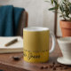 Elevate your morning coffee or tea ritual with this sophisticated, personalised mug. Featuring a striking two-tone design, the top half showcases a high-definition faux gold glitter texture that offers a luxurious metallic look without the mess. A sleek black divider line separates the shimmer from a solid warm ochre yellow base, where your custom name is displayed in an elegant, flowing black script.