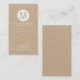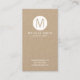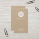 A modern minimalist design featuring monogram in white circle element with business information in white modern sans serif font style on kraft paper.