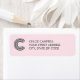 Contemporary, modern label with custom geometric initial and sans serif name/address. Lettering is a dark gunmetal grey.