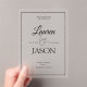 Elevate your wedding day with this stunningly modern minimalist invitation, designed to reflect the beauty and significance of your union. Its sleek typography and understated elegance create a sophisticated statement, perfect for couples who embrace refined simplicity. The transparent design allows the message of your love to take centre stage, blending seamlessly with any wedding theme.