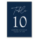 Elegant wedding table number card displaying the word "Table" in a white handwritten script with the table number, your names, and wedding date shown below with a navy background. The design repeats on the back. To order the table number cards, simply type each number and add it to your cart.