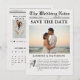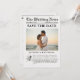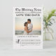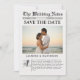 Minimalist calligraphy newspaper wedding save the date with three photos, one of the groom and bride as children and one of them as adults.