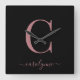 Modern Minimalist Rose Gold Monogram Script Name Square Wall Clock